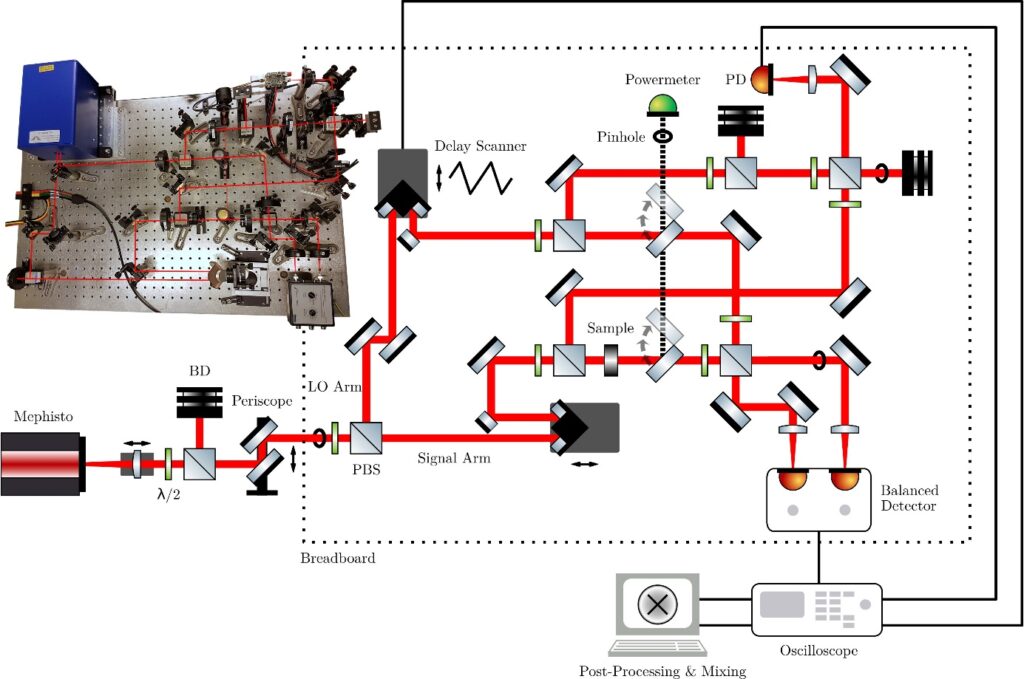 Balanced homodyne detection (BHD) setup schematic and laboratory photograph. The system comprises the main BHD beamline and a delay-calibration interferometer, which is split off before sample attenuation to provide an unattenuated reference waveform for numerical lock-in detection.