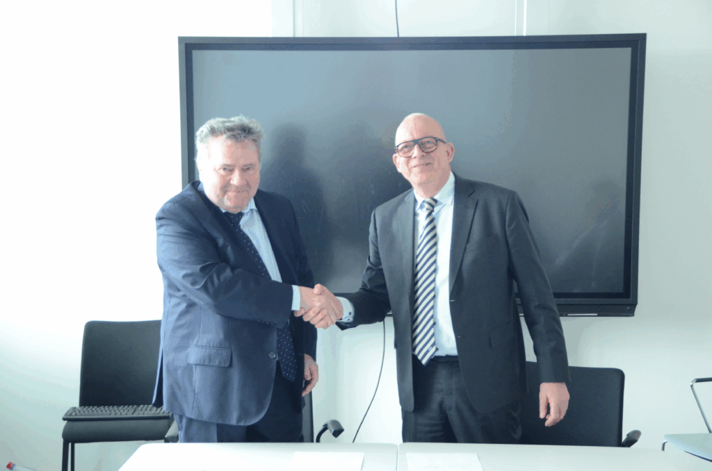 Prof. Tudor Prisecaru (left), President of the Senate of the Politehnica Bucharest, and Prof. Stefan Löhrke (right), Vice President of the RPTU, after signing the Memorandum of Understanding between the two universities.